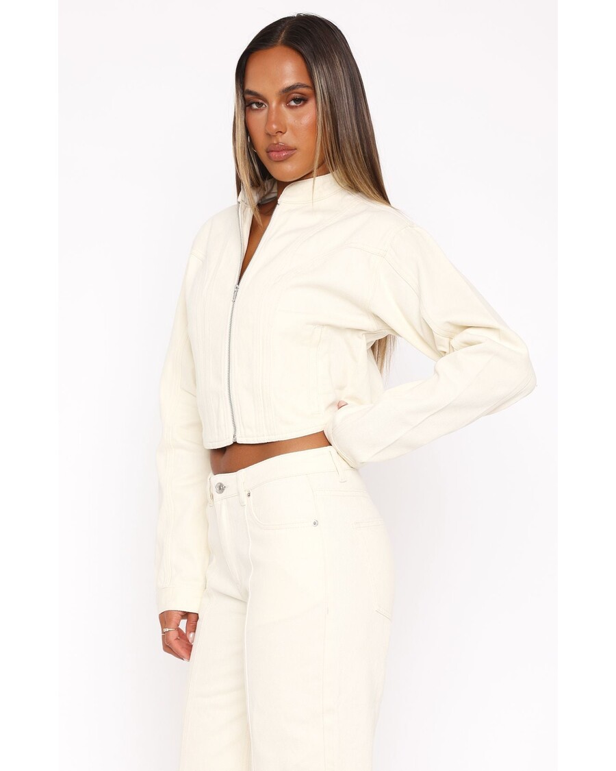 Die Leah-Denim-Jacke In Creme Ist Das Ultimative All-in-One-Outfit. Diese Stilvolle Jacke Verfügt über Einen Kragenausschnitt Und Einen Front -Reißverschluss, Sodass Sie Leicht Zu Tragen Und Zum Schichten Perfekt Zu Schichten Ist. Die Verkürzte Länge Und Das Nicht Ausgelöste Design Bieten Ein Modernes Aussehen, Während Die Detailing -Details Eine Einzigartige Note Verleiht.