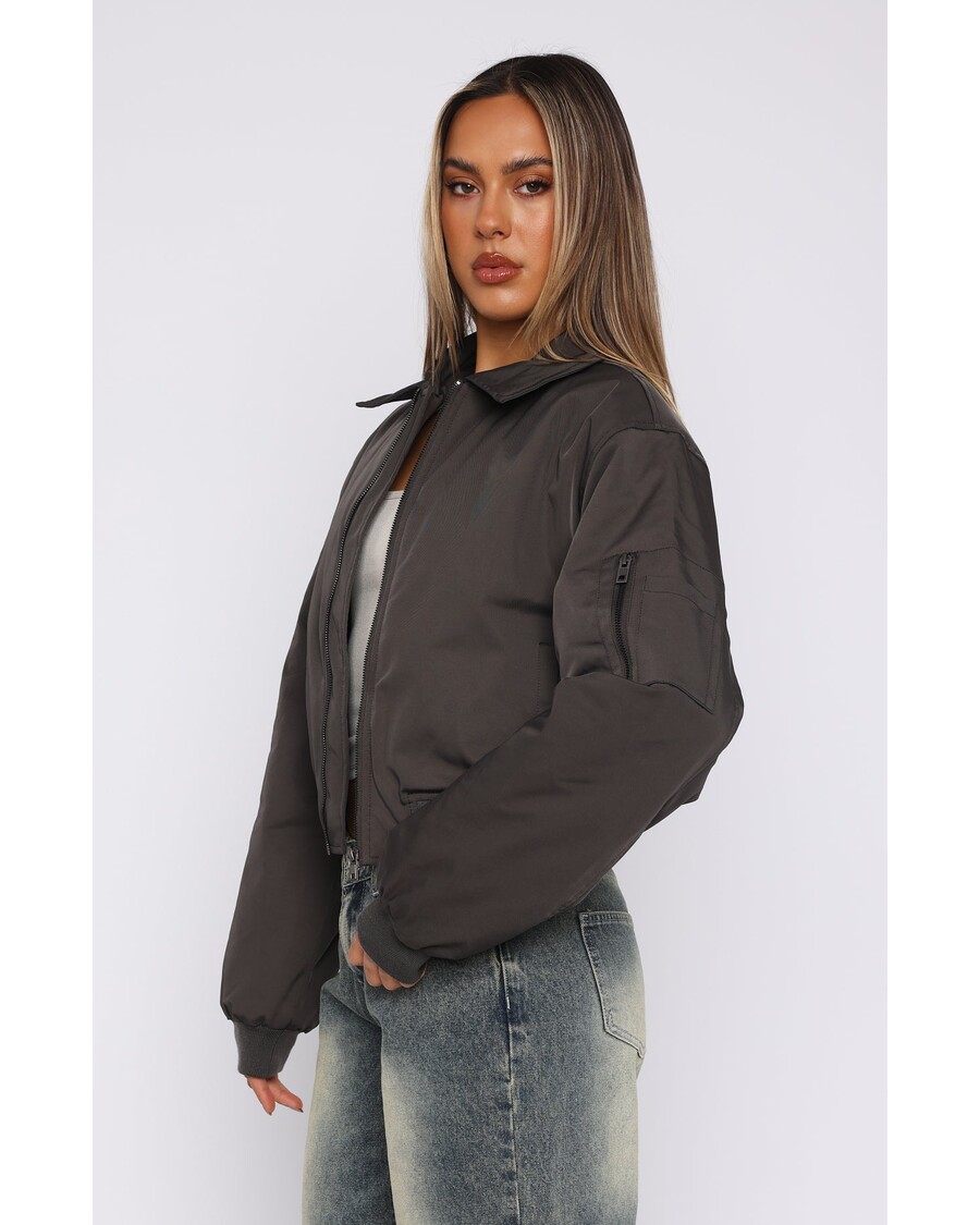 The Something Forgotten Bomber Jacket in Slate is the essential on-trend outerwear piece for the fall season. This stylish bomber jacket features a cropped length and a drop shoulder design, giving it a semi-oversized fit that is both comfortable and fashionable. The structured collar adds a touch of sophistication, while the thick fabrication with lining ensures warmth and durability.